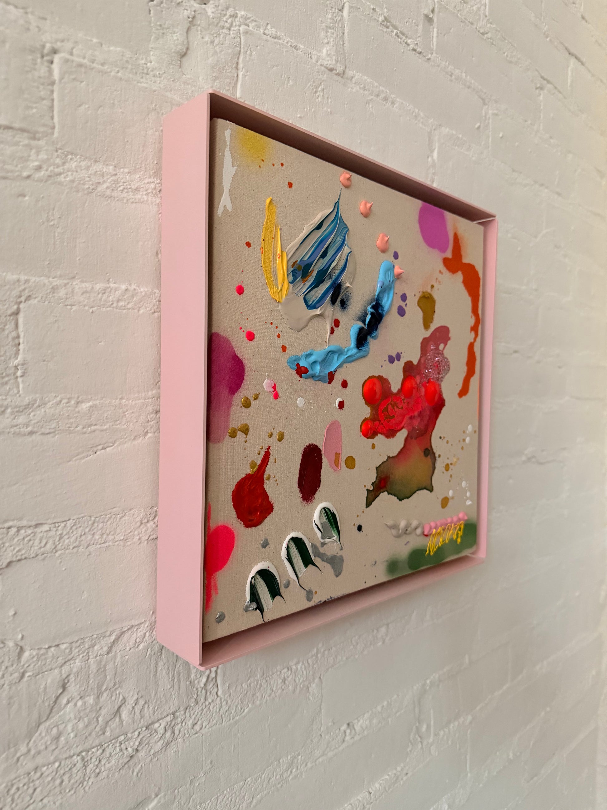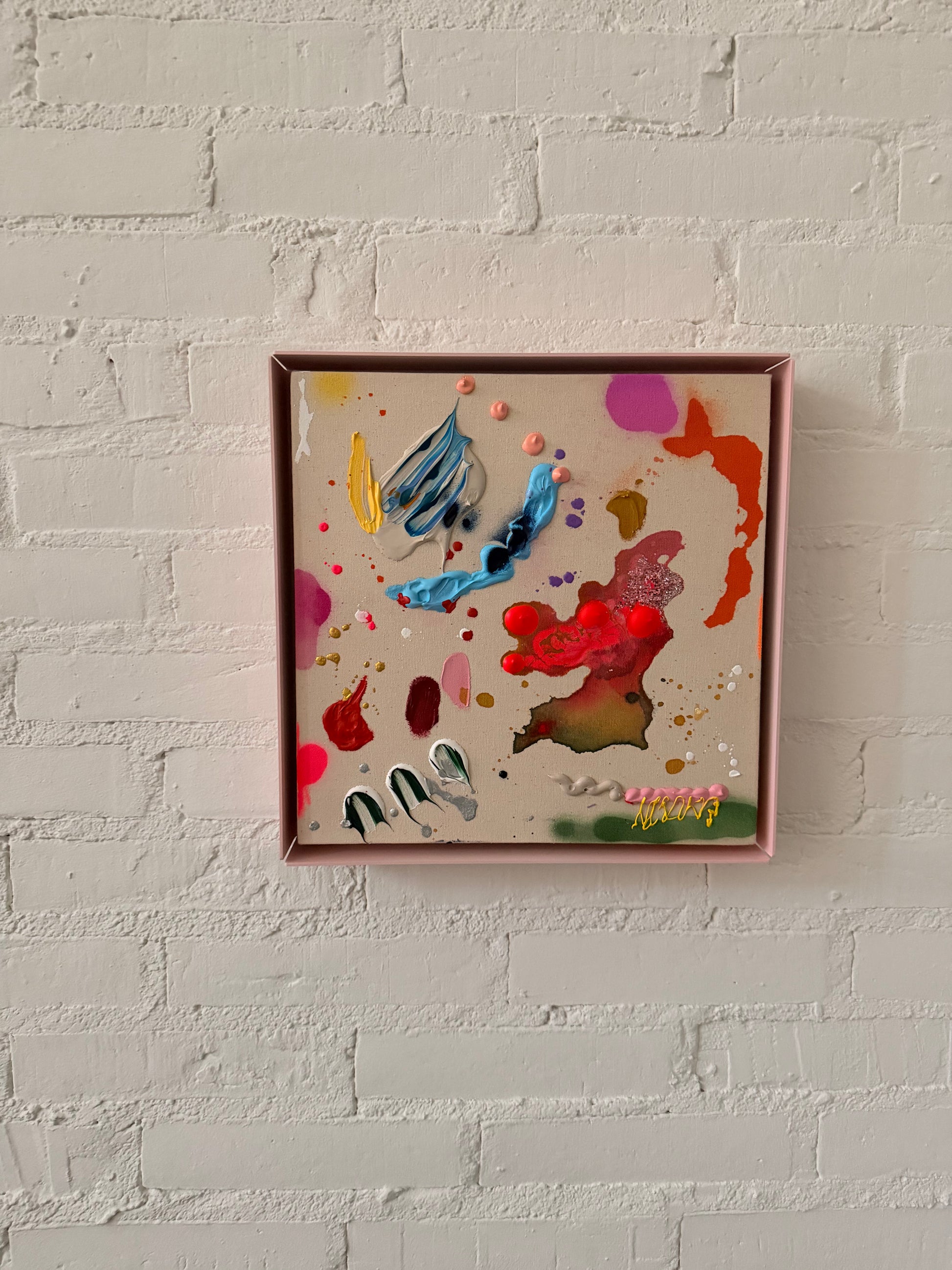30cmx30cm auf leinwand im rosa stahlrahmen. acryl, kreide, spray.