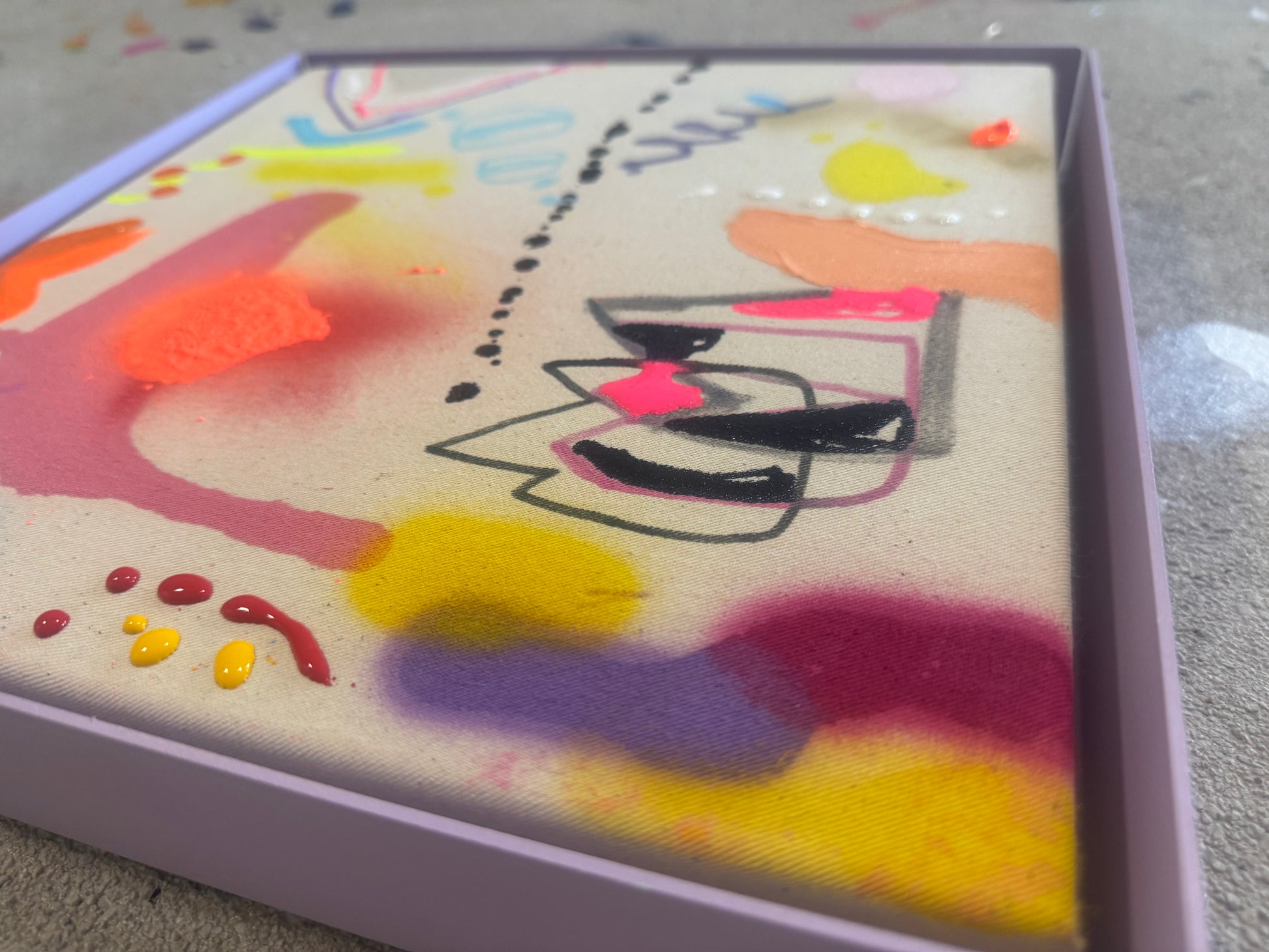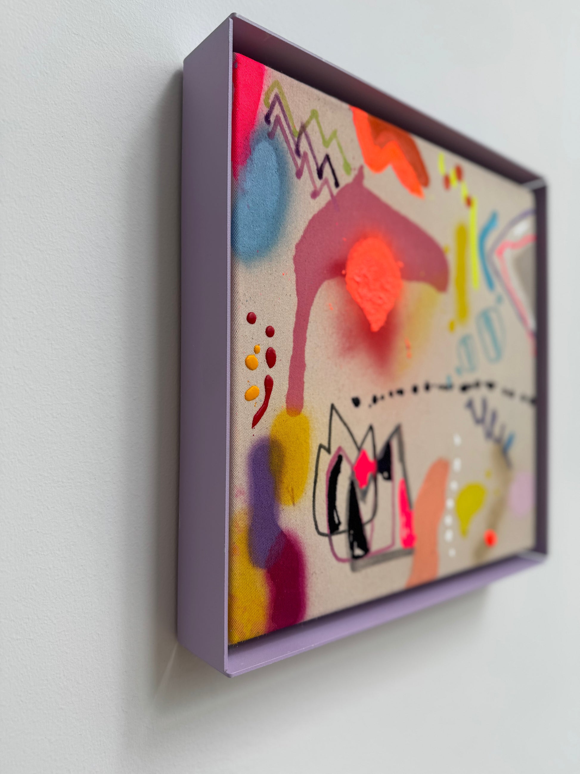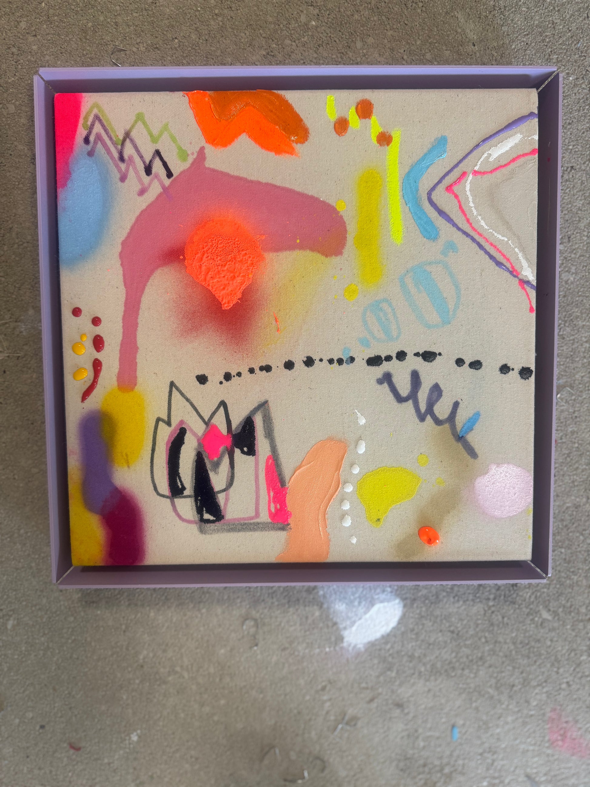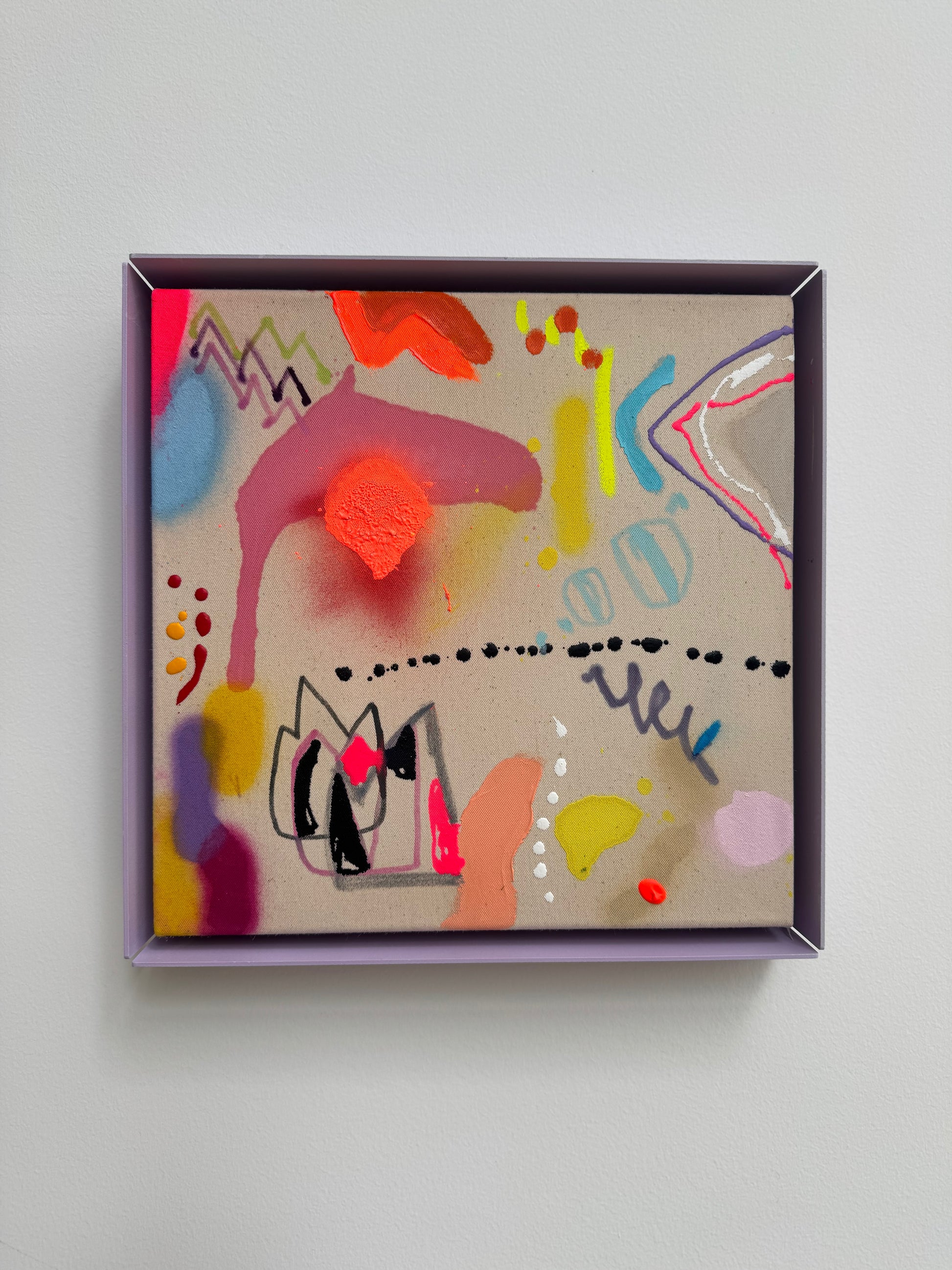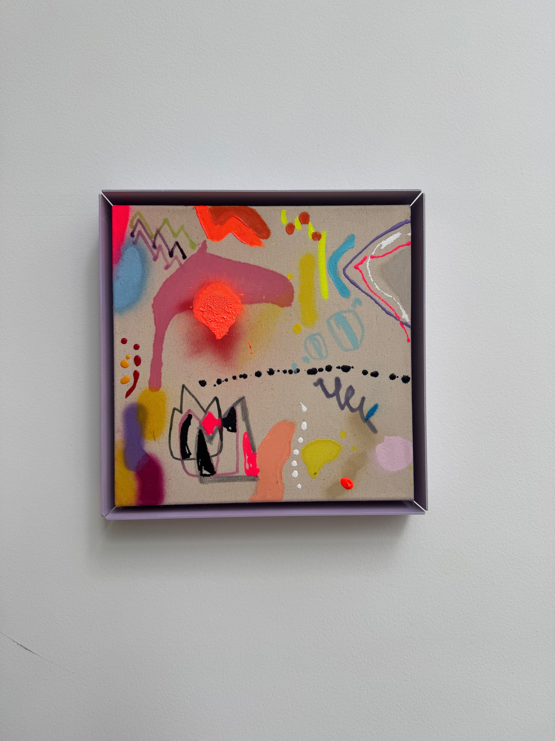 30x30cm auf baumwolle im fliederfarbenden stahlrahmen. acryl,spray,kreide.