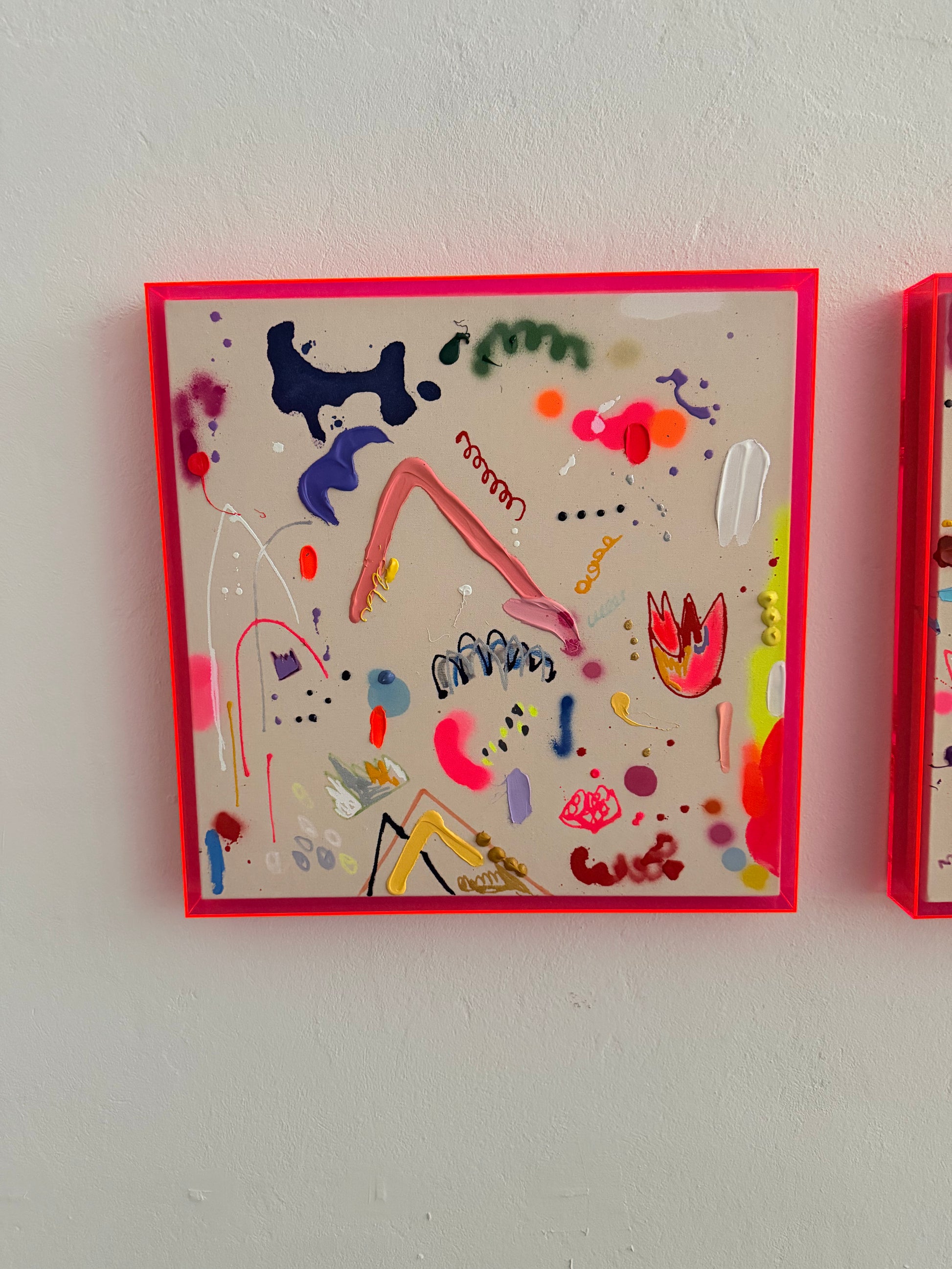 50cmx50cm auf leinwand im pinken acrylglasrahmen. acryl,kreide,spray.